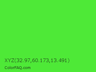 XYZ 32.97,60.173,13.491 Color is a normal green color and the nearest color is Lime Green #32cd32. Hex code #4ee937 and RGB value is rgb(78,233,55). In RGB color space, this color is composed of 31% red, 91% green, 22% blue, In CMYK color space, this color is composed of 67% cyan, 0% magenta, 76% yellow , 9% black , In HSL color space, this color has a hue angle of 112° , 80% saturation and 56% lightness.
