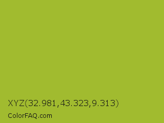 XYZ 32.981,43.323,9.313 Color is a normal lime color and the nearest color is Android Green #a4c639. Hex code #a1bb2f and RGB value is rgb(161,187,47). In RGB color space, this color is composed of 63% red, 73% green, 18% blue, In CMYK color space, this color is composed of 14% cyan, 0% magenta, 75% yellow , 27% black , In HSL color space, this color has a hue angle of 71° , 60% saturation and 46% lightness.