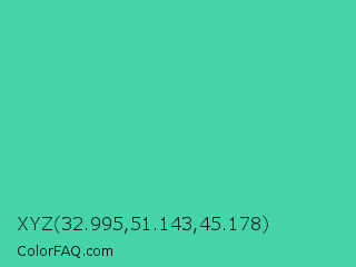 XYZ 32.995,51.143,45.178 Color is a normal green color and the nearest color is Eucalyptus #44d7a8. Hex code #44d4a8 and RGB value is rgb(68,212,168). In RGB color space, this color is composed of 27% red, 83% green, 66% blue, In CMYK color space, this color is composed of 68% cyan, 0% magenta, 21% yellow , 17% black , In HSL color space, this color has a hue angle of 162° , 63% saturation and 55% lightness.