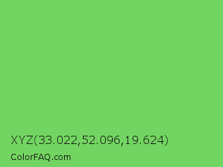 XYZ 33.022,52.096,19.624 Color is a light green color and the nearest color is Mantis #74c365. Hex code #73d561 and RGB value is rgb(115,213,97). In RGB color space, this color is composed of 45% red, 84% green, 38% blue, In CMYK color space, this color is composed of 46% cyan, 0% magenta, 54% yellow , 16% black , In HSL color space, this color has a hue angle of 111° , 58% saturation and 61% lightness.
