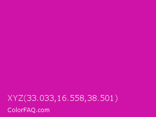 XYZ 33.033,16.558,38.501 Color is a normal magenta color and the nearest color is Royal Fuchsia #ca2c92. Hex code #cf13a8 and RGB value is rgb(207,19,168). In RGB color space, this color is composed of 81% red, 7% green, 66% blue, In CMYK color space, this color is composed of 0% cyan, 91% magenta, 19% yellow , 19% black , In HSL color space, this color has a hue angle of 312° , 83% saturation and 44% lightness.