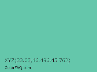 XYZ 33.03,46.496,45.762 Color is a normal green color and the nearest color is Tradewind #5fb3ac. Hex code #64c7ab and RGB value is rgb(100,199,171). In RGB color space, this color is composed of 39% red, 78% green, 67% blue, In CMYK color space, this color is composed of 50% cyan, 0% magenta, 14% yellow , 22% black , In HSL color space, this color has a hue angle of 163° , 47% saturation and 59% lightness.