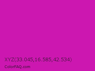 XYZ 33.045,16.585,42.534 Color is a normal magenta color and the nearest color is Byzantine #bd33a4. Hex code #cc17b0 and RGB value is rgb(204,23,176). In RGB color space, this color is composed of 80% red, 9% green, 69% blue, In CMYK color space, this color is composed of 0% cyan, 89% magenta, 14% yellow , 20% black , In HSL color space, this color has a hue angle of 309° , 80% saturation and 45% lightness.