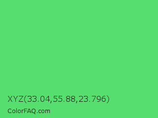 XYZ 33.04,55.88,23.796 Color is a light green color and the nearest color is Emerald #50c878. Hex code #56df6e and RGB value is rgb(86,223,110). In RGB color space, this color is composed of 34% red, 87% green, 43% blue, In CMYK color space, this color is composed of 61% cyan, 0% magenta, 51% yellow , 13% black , In HSL color space, this color has a hue angle of 131° , 68% saturation and 61% lightness.