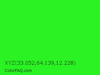 XYZ 33.052,64.139,12.228 Color is a normal green color and the nearest color is Neon Green #39ff14. Hex code #2bf223 and RGB value is rgb(43,242,35). In RGB color space, this color is composed of 17% red, 95% green, 14% blue, In CMYK color space, this color is composed of 82% cyan, 0% magenta, 86% yellow , 5% black , In HSL color space, this color has a hue angle of 118° , 89% saturation and 54% lightness.