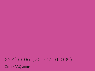 XYZ 33.061,20.347,31.039 Color is a normal magenta color and the nearest color is Pink Pantone #d74894. Hex code #cc4d96 and RGB value is rgb(204,77,150). In RGB color space, this color is composed of 80% red, 30% green, 59% blue, In CMYK color space, this color is composed of 0% cyan, 62% magenta, 26% yellow , 20% black , In HSL color space, this color has a hue angle of 326° , 55% saturation and 55% lightness.