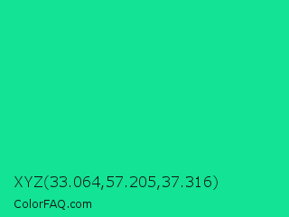XYZ 33.064,57.205,37.316 Color is a normal green color and the nearest color is Caribbean Green #00cc99. Hex code #12e394 and RGB value is rgb(18,227,148). In RGB color space, this color is composed of 7% red, 89% green, 58% blue, In CMYK color space, this color is composed of 92% cyan, 0% magenta, 35% yellow , 11% black , In HSL color space, this color has a hue angle of 157° , 85% saturation and 48% lightness.