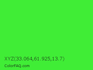 XYZ 33.064,61.925,13.7 Color is a normal green color and the nearest color is Lime Green #32cd32. Hex code #40ed36 and RGB value is rgb(64,237,54). In RGB color space, this color is composed of 25% red, 93% green, 21% blue, In CMYK color space, this color is composed of 73% cyan, 0% magenta, 77% yellow , 7% black , In HSL color space, this color has a hue angle of 117° , 84% saturation and 57% lightness.