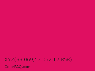 XYZ 33.069,17.052,12.858 Color is a normal rose color and the nearest color is Ruby #e0115f. Hex code #e00f61 and RGB value is rgb(224,15,97). In RGB color space, this color is composed of 88% red, 6% green, 38% blue, In CMYK color space, this color is composed of 0% cyan, 93% magenta, 57% yellow , 12% black , In HSL color space, this color has a hue angle of 336° , 87% saturation and 47% lightness.