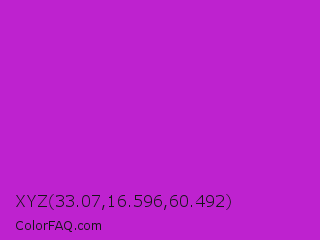XYZ 33.07,16.596,60.492 Color is a normal magenta color and the nearest color is Steel Pink #cc33cc. Hex code #be22cf and RGB value is rgb(190,34,207). In RGB color space, this color is composed of 75% red, 13% green, 81% blue, In CMYK color space, this color is composed of 8% cyan, 84% magenta, 0% yellow , 19% black , In HSL color space, this color has a hue angle of 294° , 72% saturation and 47% lightness.