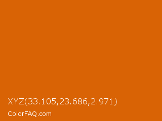 XYZ 33.105,23.686,2.971 Color is a normal orange color and the nearest color is Bamboo #da6304. Hex code #d96305 and RGB value is rgb(217,99,5). In RGB color space, this color is composed of 85% red, 39% green, 2% blue, In CMYK color space, this color is composed of 0% cyan, 54% magenta, 98% yellow , 15% black , In HSL color space, this color has a hue angle of 27° , 95% saturation and 44% lightness.