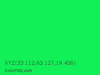 XYZ 33.112,63.127,19.456 Color is a normal green color and the nearest color is Malachite #0bda51. Hex code #11f057 and RGB value is rgb(17,240,87). In RGB color space, this color is composed of 7% red, 94% green, 34% blue, In CMYK color space, this color is composed of 93% cyan, 0% magenta, 64% yellow , 6% black , In HSL color space, this color has a hue angle of 139° , 88% saturation and 50% lightness.
