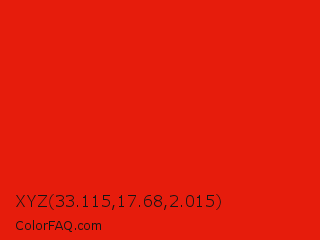 XYZ 33.115,17.68,2.015 Color is a normal red color and the nearest color is Lust #e62020. Hex code #e61c0c and RGB value is rgb(230,28,12). In RGB color space, this color is composed of 90% red, 11% green, 5% blue, In CMYK color space, this color is composed of 0% cyan, 88% magenta, 95% yellow , 10% black , In HSL color space, this color has a hue angle of 4° , 90% saturation and 47% lightness.
