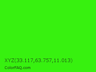 XYZ 33.117,63.757,11.013 Color is a normal green color and the nearest color is Neon Green #39ff14. Hex code #37f10f and RGB value is rgb(55,241,15). In RGB color space, this color is composed of 22% red, 95% green, 6% blue, In CMYK color space, this color is composed of 77% cyan, 0% magenta, 94% yellow , 5% black , In HSL color space, this color has a hue angle of 109° , 89% saturation and 50% lightness.