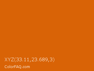 XYZ 33.11,23.689,3 Color is a normal orange color and the nearest color is Bamboo #da6304. Hex code #d96306 and RGB value is rgb(217,99,6). In RGB color space, this color is composed of 85% red, 39% green, 2% blue, In CMYK color space, this color is composed of 0% cyan, 54% magenta, 97% yellow , 15% black , In HSL color space, this color has a hue angle of 26° , 95% saturation and 44% lightness.