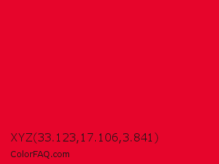 XYZ 33.123,17.106,3.841 Color is a normal red color and the nearest color is Medium Candy Apple Red #e2062c. Hex code #e6052b and RGB value is rgb(230,5,43). In RGB color space, this color is composed of 90% red, 2% green, 17% blue, In CMYK color space, this color is composed of 0% cyan, 98% magenta, 81% yellow , 10% black , In HSL color space, this color has a hue angle of 350° , 96% saturation and 46% lightness.