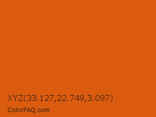 XYZ 33.127,22.749,3.097 Color is a normal orange color and the nearest color is Bamboo #da6304. Hex code #db5c0f and RGB value is rgb(219,92,15). In RGB color space, this color is composed of 86% red, 36% green, 6% blue, In CMYK color space, this color is composed of 0% cyan, 58% magenta, 93% yellow , 14% black , In HSL color space, this color has a hue angle of 23° , 87% saturation and 46% lightness.