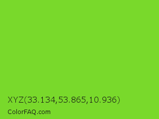 XYZ 33.134,53.865,10.936 Color is a normal green color and the nearest color is Kiwi #8ee53f. Hex code #79d92b and RGB value is rgb(121,217,43). In RGB color space, this color is composed of 47% red, 85% green, 17% blue, In CMYK color space, this color is composed of 44% cyan, 0% magenta, 80% yellow , 15% black , In HSL color space, this color has a hue angle of 93° , 70% saturation and 51% lightness.