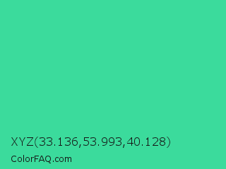 XYZ 33.136,53.993,40.128 Color is a normal green color and the nearest color is Eucalyptus #44d7a8. Hex code #3bdb9c and RGB value is rgb(59,219,156). In RGB color space, this color is composed of 23% red, 86% green, 61% blue, In CMYK color space, this color is composed of 73% cyan, 0% magenta, 29% yellow , 14% black , In HSL color space, this color has a hue angle of 156° , 69% saturation and 55% lightness.