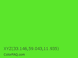 XYZ 33.146,59.043,11.935 Color is a normal green color and the nearest color is Harlequin Green #46cb18. Hex code #5ce62b and RGB value is rgb(92,230,43). In RGB color space, this color is composed of 36% red, 90% green, 17% blue, In CMYK color space, this color is composed of 60% cyan, 0% magenta, 81% yellow , 10% black , In HSL color space, this color has a hue angle of 104° , 79% saturation and 54% lightness.