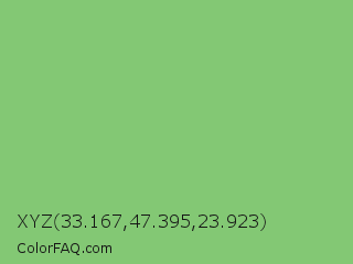 XYZ 33.167,47.395,23.923 Color is a light green color and the nearest color is Pistachio #93c572. Hex code #83c874 and RGB value is rgb(131,200,116). In RGB color space, this color is composed of 51% red, 78% green, 45% blue, In CMYK color space, this color is composed of 35% cyan, 0% magenta, 42% yellow , 22% black , In HSL color space, this color has a hue angle of 109° , 43% saturation and 62% lightness.