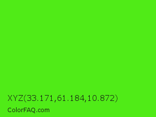 XYZ 33.171,61.184,10.872 Color is a normal green color and the nearest color is Neon Green #39ff14. Hex code #50eb17 and RGB value is rgb(80,235,23). In RGB color space, this color is composed of 31% red, 92% green, 9% blue, In CMYK color space, this color is composed of 66% cyan, 0% magenta, 90% yellow , 8% black , In HSL color space, this color has a hue angle of 104° , 84% saturation and 51% lightness.