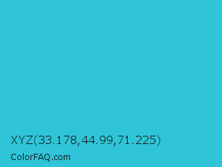 XYZ 33.178,44.99,71.225 Color is a normal cyan color and the nearest color is Scooter #2ebfd4. Hex code #2fc4d7 and RGB value is rgb(47,196,215). In RGB color space, this color is composed of 18% red, 77% green, 84% blue, In CMYK color space, this color is composed of 78% cyan, 9% magenta, 0% yellow , 16% black , In HSL color space, this color has a hue angle of 187° , 68% saturation and 51% lightness.