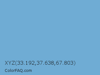 XYZ 33.192,37.638,67.803 Color is a light blue color and the nearest color is Iceberg #71a6d2. Hex code #6facd4 and RGB value is rgb(111,172,212). In RGB color space, this color is composed of 44% red, 67% green, 83% blue, In CMYK color space, this color is composed of 48% cyan, 19% magenta, 0% yellow , 17% black , In HSL color space, this color has a hue angle of 204° , 54% saturation and 63% lightness.