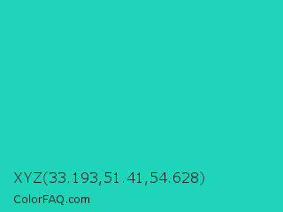 XYZ 33.193,51.41,54.628 Color is a normal cyan color and the nearest color is Java #1fc2c2. Hex code #1ed5ba and RGB value is rgb(30,213,186). In RGB color space, this color is composed of 12% red, 84% green, 73% blue, In CMYK color space, this color is composed of 86% cyan, 0% magenta, 13% yellow , 16% black , In HSL color space, this color has a hue angle of 171° , 75% saturation and 48% lightness.