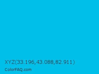 XYZ 33.196,43.088,82.911 Color is a normal cyan color and the nearest color is Cyan Process #00b7eb. Hex code #00bfe8 and RGB value is rgb(0,191,232). In RGB color space, this color is composed of 0% red, 75% green, 91% blue, In CMYK color space, this color is composed of 100% cyan, 18% magenta, 0% yellow , 9% black , In HSL color space, this color has a hue angle of 191° , 100% saturation and 45% lightness.