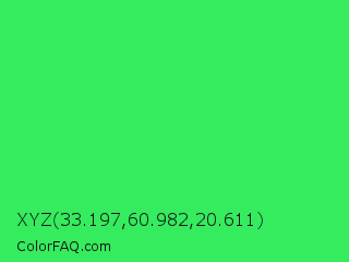 XYZ 33.197,60.982,20.611 Color is a normal green color and the nearest color is UFO Green #3cd070. Hex code #35eb5e and RGB value is rgb(53,235,94). In RGB color space, this color is composed of 21% red, 92% green, 37% blue, In CMYK color space, this color is composed of 77% cyan, 0% magenta, 60% yellow , 8% black , In HSL color space, this color has a hue angle of 134° , 82% saturation and 56% lightness.