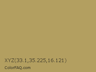 XYZ 33.1,35.225,16.121 Color is a normal yellow color and the nearest color is Husk #b7a458. Hex code #b39f60 and RGB value is rgb(179,159,96). In RGB color space, this color is composed of 70% red, 62% green, 38% blue, In CMYK color space, this color is composed of 0% cyan, 11% magenta, 46% yellow , 30% black , In HSL color space, this color has a hue angle of 46° , 35% saturation and 54% lightness.