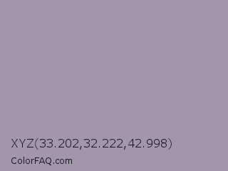 XYZ 33.202,32.222,42.998 Color is a light purple color and the nearest color is Heliotrope Gray #aa98a9. Hex code #a395ab and RGB value is rgb(163,149,171). In RGB color space, this color is composed of 64% red, 58% green, 67% blue, In CMYK color space, this color is composed of 5% cyan, 13% magenta, 0% yellow , 33% black , In HSL color space, this color has a hue angle of 278° , 12% saturation and 63% lightness.