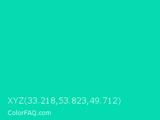 XYZ 33.218,53.823,49.712 Color is a normal cyan color and the nearest color is Amazonite #00c4b0. Hex code #04dbb0 and RGB value is rgb(4,219,176). In RGB color space, this color is composed of 2% red, 86% green, 69% blue, In CMYK color space, this color is composed of 98% cyan, 0% magenta, 20% yellow , 14% black , In HSL color space, this color has a hue angle of 168° , 96% saturation and 44% lightness.