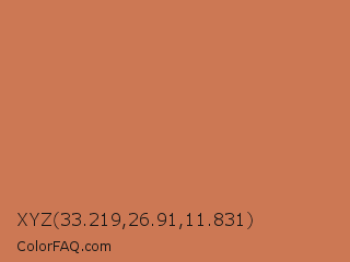 XYZ 33.219,26.91,11.831 Color is a normal orange color and the nearest color is Copper Red #cb6d51. Hex code #cc7854 and RGB value is rgb(204,120,84). In RGB color space, this color is composed of 80% red, 47% green, 33% blue, In CMYK color space, this color is composed of 0% cyan, 41% magenta, 59% yellow , 20% black , In HSL color space, this color has a hue angle of 18° , 54% saturation and 56% lightness.