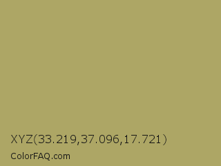 XYZ 33.219,37.096,17.721 Color is a normal yellow color and the nearest color is Green Smoke #a4af6e. Hex code #ada665 and RGB value is rgb(173,166,101). In RGB color space, this color is composed of 68% red, 65% green, 40% blue, In CMYK color space, this color is composed of 0% cyan, 4% magenta, 42% yellow , 32% black , In HSL color space, this color has a hue angle of 54° , 31% saturation and 54% lightness.