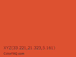 XYZ 33.221,21.323,5.161 Color is a normal red color and the nearest color is Punch #dc4333. Hex code #dd5030 and RGB value is rgb(221,80,48). In RGB color space, this color is composed of 87% red, 31% green, 19% blue, In CMYK color space, this color is composed of 0% cyan, 64% magenta, 78% yellow , 13% black , In HSL color space, this color has a hue angle of 11° , 72% saturation and 53% lightness.