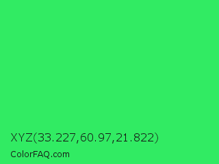XYZ 33.227,60.97,21.822 Color is a normal green color and the nearest color is UFO Green #3cd070. Hex code #31eb63 and RGB value is rgb(49,235,99). In RGB color space, this color is composed of 19% red, 92% green, 39% blue, In CMYK color space, this color is composed of 79% cyan, 0% magenta, 58% yellow , 8% black , In HSL color space, this color has a hue angle of 136° , 82% saturation and 56% lightness.