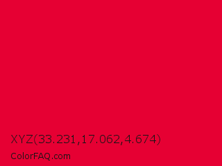 XYZ 33.231,17.062,4.674 Color is a normal red color and the nearest color is Medium Candy Apple Red #e2062c. Hex code #e60033 and RGB value is rgb(230,0,51). In RGB color space, this color is composed of 90% red, 0% green, 20% blue, In CMYK color space, this color is composed of 0% cyan, 100% magenta, 78% yellow , 10% black , In HSL color space, this color has a hue angle of 347° , 100% saturation and 45% lightness.