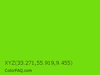 XYZ 33.271,55.919,9.455 Color is a normal green color and the nearest color is Alien Armpit #84de02. Hex code #73de0e and RGB value is rgb(115,222,14). In RGB color space, this color is composed of 45% red, 87% green, 5% blue, In CMYK color space, this color is composed of 48% cyan, 0% magenta, 94% yellow , 13% black , In HSL color space, this color has a hue angle of 91° , 88% saturation and 46% lightness.