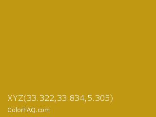 XYZ 33.322,33.834,5.305 Color is a normal yellow color and the nearest color is Pizza #c99415. Hex code #c19811 and RGB value is rgb(193,152,17). In RGB color space, this color is composed of 76% red, 60% green, 7% blue, In CMYK color space, this color is composed of 0% cyan, 21% magenta, 91% yellow , 24% black , In HSL color space, this color has a hue angle of 46° , 84% saturation and 41% lightness.