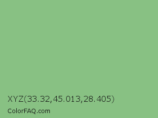 XYZ 33.32,45.013,28.405 Color is a light green color and the nearest color is Dark Sea Green #8fbc8f. Hex code #88c183 and RGB value is rgb(136,193,131). In RGB color space, this color is composed of 53% red, 76% green, 51% blue, In CMYK color space, this color is composed of 30% cyan, 0% magenta, 32% yellow , 24% black , In HSL color space, this color has a hue angle of 115° , 33% saturation and 64% lightness.