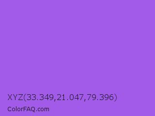 XYZ 33.349,21.047,79.396 Color is a light violet color and the nearest color is Navy Purple #9457eb. Hex code #a25be9 and RGB value is rgb(162,91,233). In RGB color space, this color is composed of 64% red, 36% green, 91% blue, In CMYK color space, this color is composed of 30% cyan, 61% magenta, 0% yellow , 9% black , In HSL color space, this color has a hue angle of 270° , 76% saturation and 64% lightness.