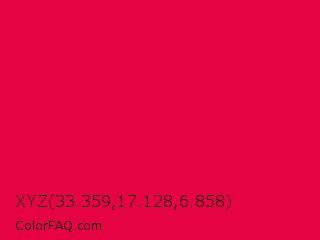 XYZ 33.359,17.128,6.858 Color is a normal rose color and the nearest color is Red Ribbon #ed0a3f. Hex code #e50343 and RGB value is rgb(229,3,67). In RGB color space, this color is composed of 90% red, 1% green, 26% blue, In CMYK color space, this color is composed of 0% cyan, 99% magenta, 71% yellow , 10% black , In HSL color space, this color has a hue angle of 343° , 97% saturation and 45% lightness.