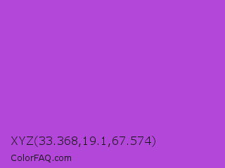 XYZ 33.368,19.1,67.574 Color is a normal purple color and the nearest color is Medium Orchid #ba55d3. Hex code #b347d9 and RGB value is rgb(179,71,217). In RGB color space, this color is composed of 70% red, 28% green, 85% blue, In CMYK color space, this color is composed of 18% cyan, 67% magenta, 0% yellow , 15% black , In HSL color space, this color has a hue angle of 284° , 66% saturation and 56% lightness.