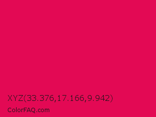 XYZ 33.376,17.166,9.942 Color is a normal rose color and the nearest color is Razzmatazz Crayola #e30b5c. Hex code #e30954 and RGB value is rgb(227,9,84). In RGB color space, this color is composed of 89% red, 4% green, 33% blue, In CMYK color space, this color is composed of 0% cyan, 96% magenta, 63% yellow , 11% black , In HSL color space, this color has a hue angle of 339° , 92% saturation and 46% lightness.