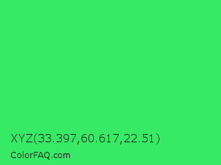 XYZ 33.397,60.617,22.51 Color is a normal green color and the nearest color is UFO Green #3cd070. Hex code #37ea66 and RGB value is rgb(55,234,102). In RGB color space, this color is composed of 22% red, 92% green, 40% blue, In CMYK color space, this color is composed of 76% cyan, 0% magenta, 56% yellow , 8% black , In HSL color space, this color has a hue angle of 136° , 81% saturation and 57% lightness.