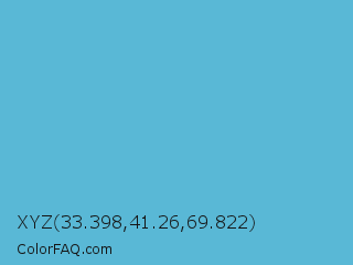 XYZ 33.398,41.26,69.822 Color is a normal blue color and the nearest color is Shakespeare #4eabd1. Hex code #59b8d6 and RGB value is rgb(89,184,214). In RGB color space, this color is composed of 35% red, 72% green, 84% blue, In CMYK color space, this color is composed of 58% cyan, 14% magenta, 0% yellow , 16% black , In HSL color space, this color has a hue angle of 194° , 60% saturation and 59% lightness.