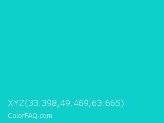 XYZ 33.398,49.469,63.665 Color is a normal cyan color and the nearest color is Robins Egg Blue #00cccc. Hex code #0ed0ca and RGB value is rgb(14,208,202). In RGB color space, this color is composed of 5% red, 82% green, 79% blue, In CMYK color space, this color is composed of 93% cyan, 0% magenta, 3% yellow , 18% black , In HSL color space, this color has a hue angle of 178° , 87% saturation and 44% lightness.