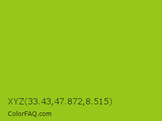 XYZ 33.43,47.872,8.515 Color is a normal lime color and the nearest color is Atlantis #97cd2d. Hex code #96c81b and RGB value is rgb(150,200,27). In RGB color space, this color is composed of 59% red, 78% green, 11% blue, In CMYK color space, this color is composed of 25% cyan, 0% magenta, 87% yellow , 22% black , In HSL color space, this color has a hue angle of 77° , 76% saturation and 45% lightness.